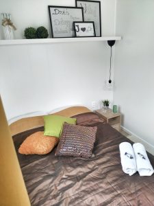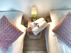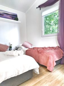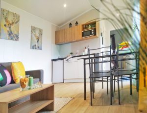 Idealne miejsce dla rodziny lub grupy znajomych. Domki z dwoma sypialniami, salonem, wyposażoną kuchnią i łazienką, posiadające aż sześć miejsc noclegowych. Otwarta kuchnia wyposażona we wszystkie niezbędne sprzęty: lodówka, mikrofalówka, czajnik elektryczny. Herbata i kawa są do dyspozycji gości w cenie noclegu. Na każdym tarasie do Państwa dyspozycji jest stół i ławy mieszczące 6 osób. Każdy z domków wyposażony jest w dostęp do klimatyzacji, szybkiego internetu oraz Smart TV.