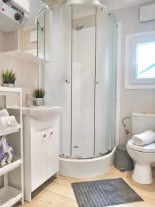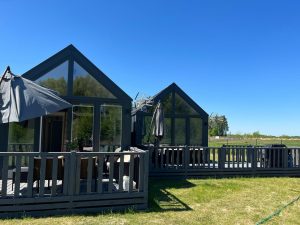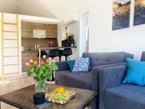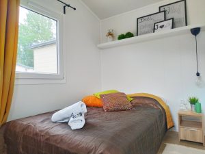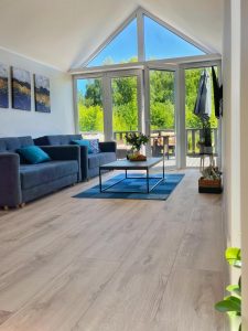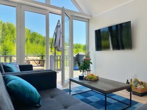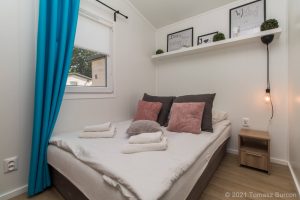 Idealne miejsce dla rodziny lub grupy znajomych. Domki z dwoma sypialniami, salonem, wyposażoną kuchnią i łazienką, posiadające aż sześć miejsc noclegowych. Otwarta kuchnia wyposażona we wszystkie niezbędne sprzęty: lodówka, mikrofalówka, czajnik elektryczny. Herbata i kawa są do dyspozycji gości w cenie noclegu. Na każdym tarasie do Państwa dyspozycji jest stół i ławy mieszczące 8 osób. Każdy z domków wyposażony jest w dostęp do klimatyzacji, szybkiego internetu oraz Smart TV.